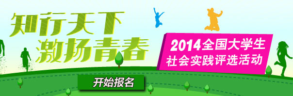 以學(xué)習(xí)宣傳習(xí)近平總書記2014年“五四講話”精神為契機(jī),以引導(dǎo)青年學(xué)生培育和踐行社會(huì)主義核心價(jià)值觀為重點(diǎn),引導(dǎo)廣大青年學(xué)生深入社會(huì)、了解國(guó)情、接受鍛煉,堅(jiān)定為實(shí)現(xiàn)中國(guó)夢(mèng)努力奮斗的理想信念,人民網(wǎng)將舉辦“2014全國(guó)大學(xué)生社會(huì)實(shí)踐評(píng)選”活動(dòng)。本活動(dòng)以“知行天下,激揚(yáng)青春”為主題,面向全國(guó)大學(xué)生征集暑期社會(huì)實(shí)踐成果報(bào)告,通過(guò)展示和評(píng)選的過(guò)程,對(duì)內(nèi)容充實(shí)、成果突出、事跡典型的團(tuán)隊(duì)或個(gè)人進(jìn)行宣傳和表彰。