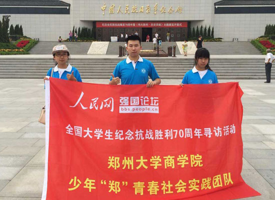 7月16日,鄭州大學(xué)“少年鄭青春”暑期實(shí)踐隊(duì),開展了“緬懷革命先烈,樹立信心實(shí)現(xiàn)中國夢”實(shí)踐活動(dòng)。團(tuán)隊(duì)通過抗戰(zhàn)知識調(diào)研、參觀抗戰(zhàn)紀(jì)念館、采訪抗戰(zhàn)老兵、向幼兒園孩子普及抗戰(zhàn)知識等方式紀(jì)念抗戰(zhàn)勝利70周年。
