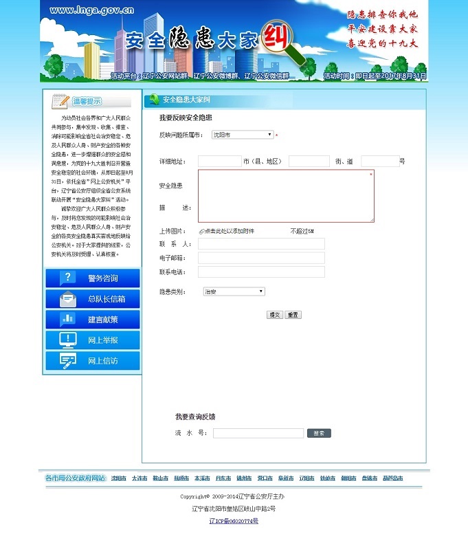 為深入貫徹落實習(xí)近平總書記系列重要講話精神,充分發(fā)揮全省“網(wǎng)上公安機關(guān)”平臺作用,遼寧省公安廳從即日起至8月31日,組織全省公安機關(guān)依托各級公安政務(wù)網(wǎng)站、公安政務(wù)微博、公安政務(wù)微信平臺,集中開展“安全隱患大家糾”活動,全面開啟遼寧公安“查患治患”工作的“互聯(lián)網(wǎng)+”模式。