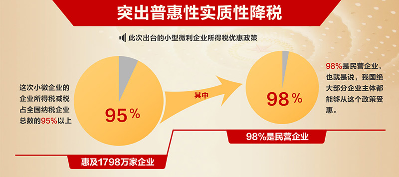 張連起:提高增值稅小規(guī)模納稅人起征點,放寬小型微利企業(yè)標準并加大優(yōu)惠力度。這比原來認定的標準有大幅度的提升,也就是說有更多的企業(yè)會被認定為小型微利企業(yè)。據(jù)測算,認定為小型微利企業(yè)戶數(shù)1798萬戶,占全部納稅企業(yè)的比重超過95%,其中98%是民營企業(yè)。也就是說,我國絕大部分企業(yè)主體都能夠從這個政策中受惠。