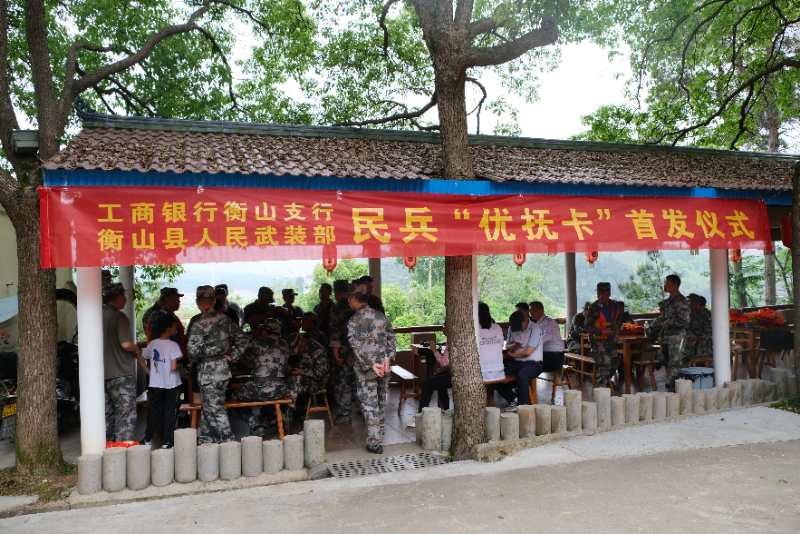 前不久,衡山縣人武部與中國工商銀行衡山支行舉行民兵“優(yōu)撫卡”首發(fā)儀式,給正在參加防汛演練的30余名基干民兵送去了一份特別的小禮物——“隨軍行擁軍優(yōu)撫卡”。 這張卡,是今年年初該縣人武部主動與銀行進行溝通協(xié)調(diào)后,專門設計制作的一張融身份識別功能與金融服務功能于一體的民兵優(yōu)撫卡?ǖ恼姹尘皥D案是一位身著軍裝的民兵照片,并印有“隨軍行擁軍優(yōu)撫卡”字樣。