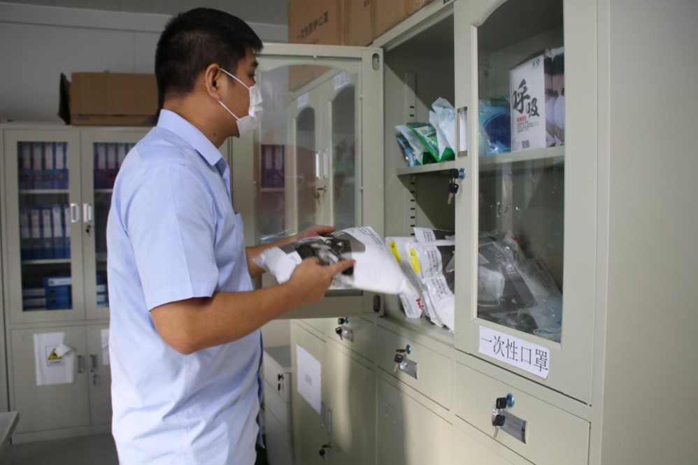 圖為郭衛(wèi)紅為員工發(fā)放防護(hù)用品前進(jìn)行檢查