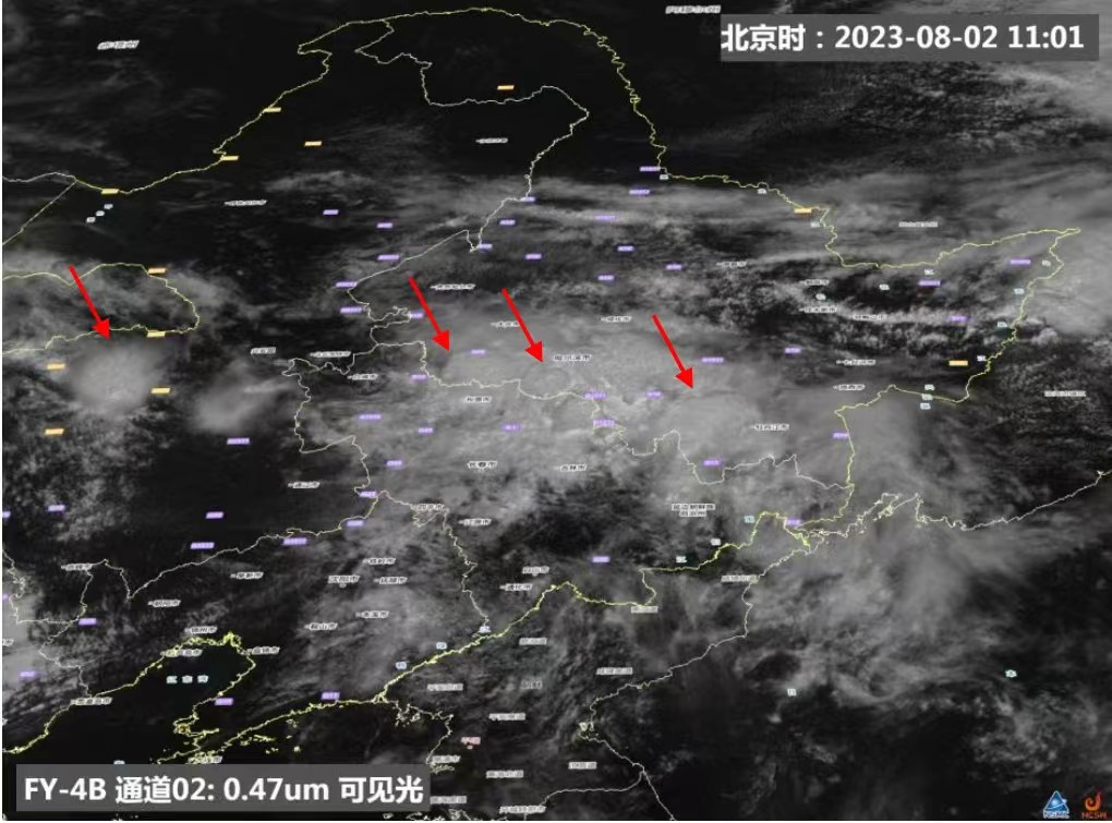 風云四號B星可見光圖像顯示,黑龍江南部、吉林省北部以及內蒙古中東部局地的對流活動明顯,出現(xiàn)白亮的上沖云頂。圖片來源:國家衛(wèi)星氣象中心